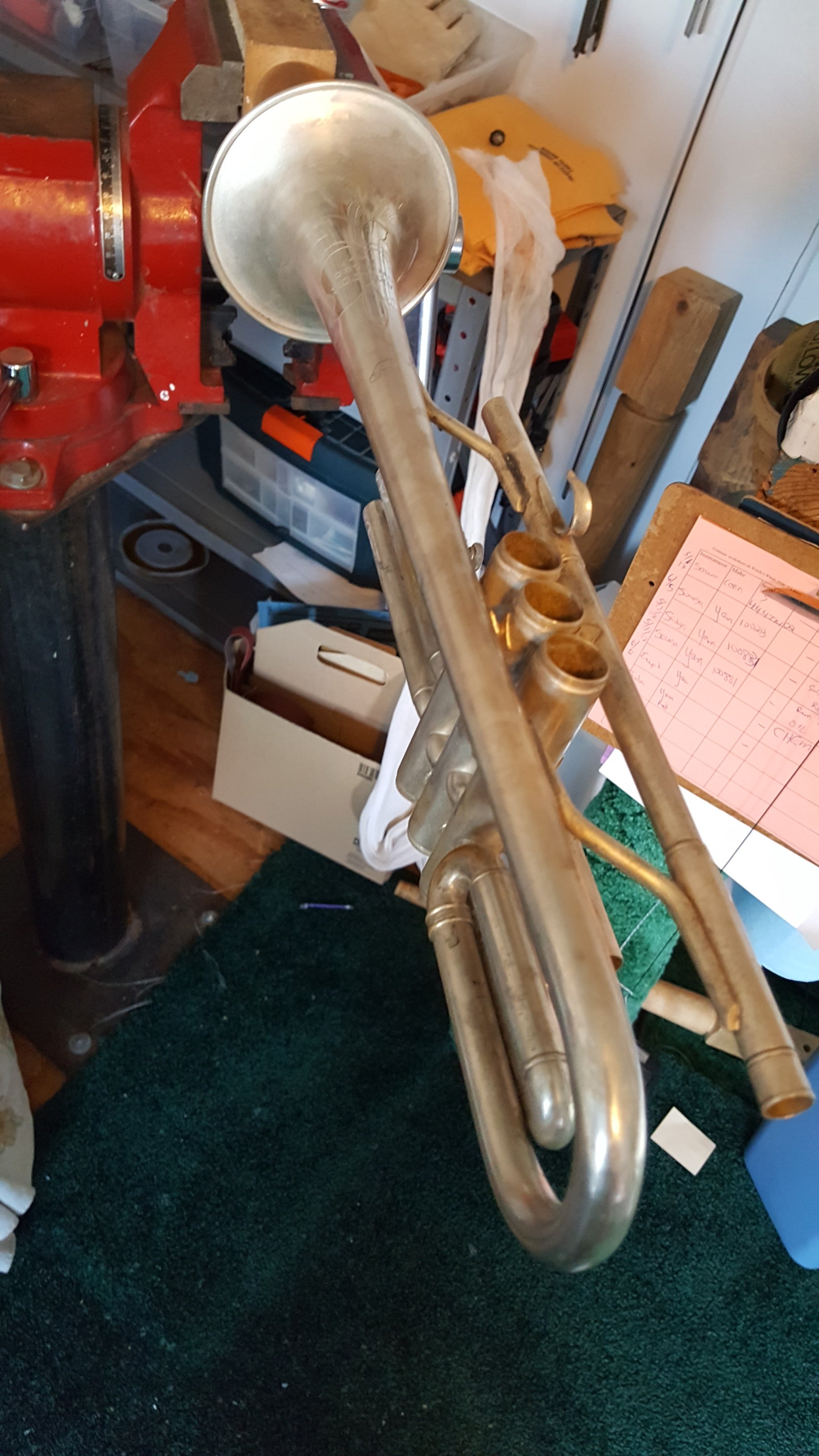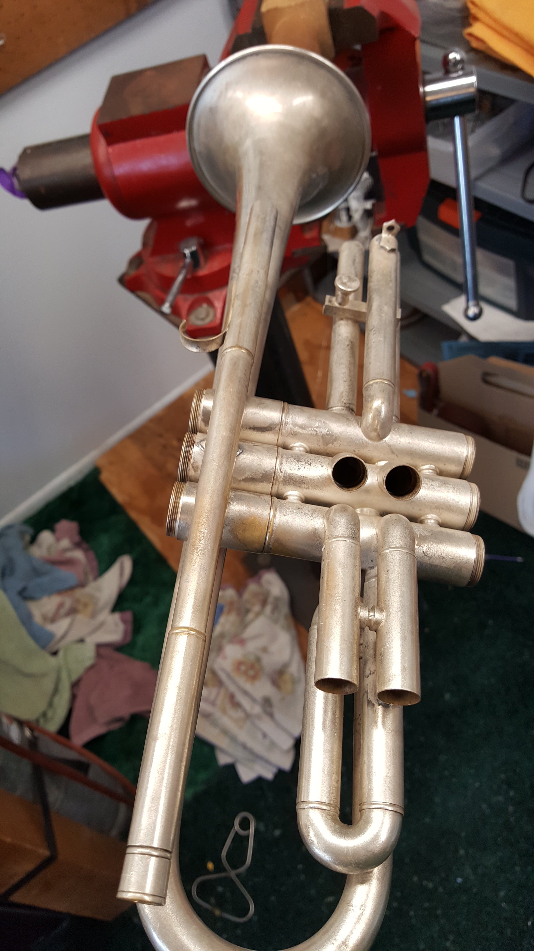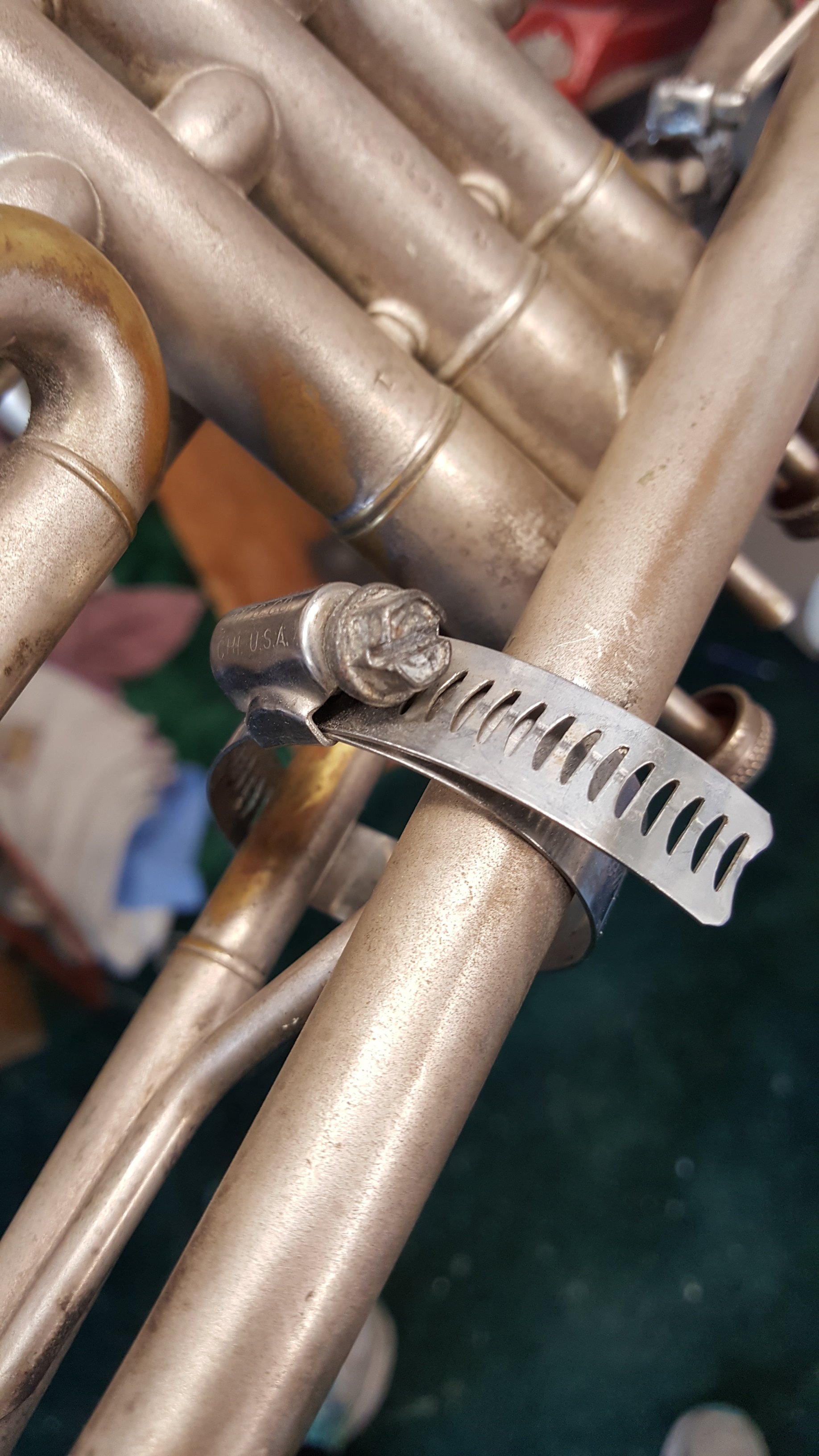 Just because I decided to take on a Saturday emergency. Kid needed his grandpa’s horn working for band on Monday. First time I’ve seen hose clamps to hold a horn together. Rather clever as there was not adhesive to remove like duct tape or super glue which takes my time and their money.