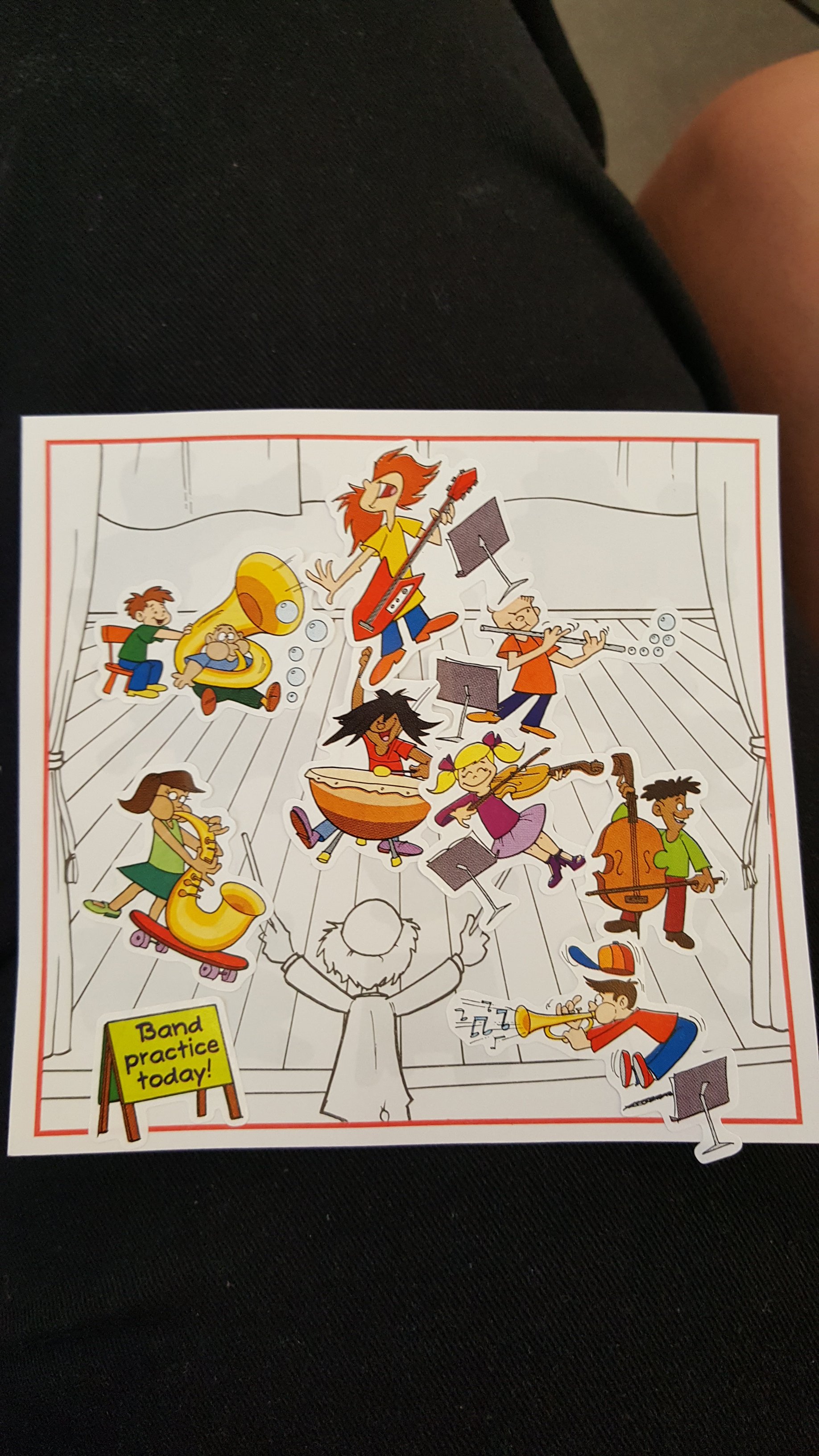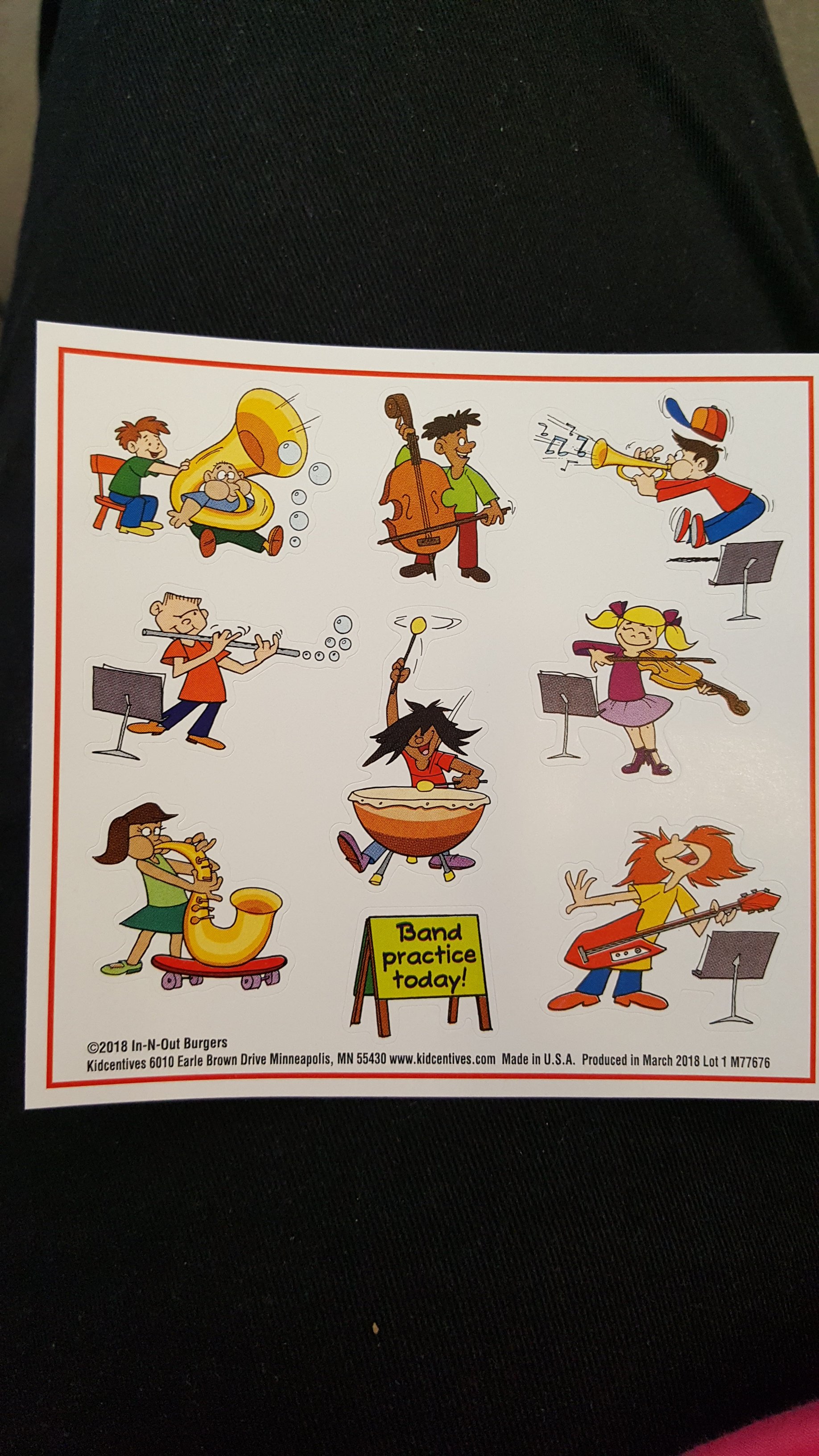 Stopped in for a bite to eat and love the sticker activity. Love that that have a Sousaphone and Flute, I get the string bass only because I’ve sorted enough concert band music to know there is often a Bass part written, but the electric guitar is a hoot.